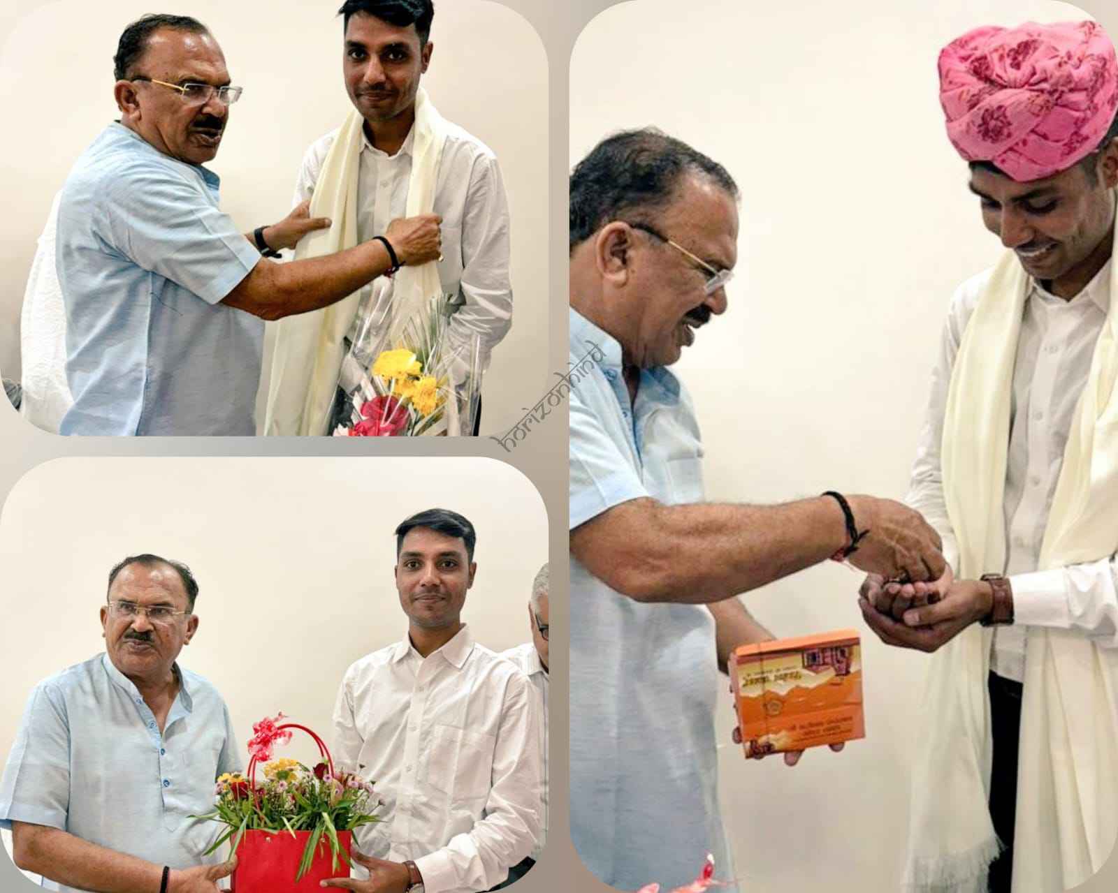 अजमेर न्यूज़: अजमेर . 16 अक्टूबर। राजस्थान विधानसभा अध्यक्ष श्री वासुदेव देवनानी ने राजस्थान प्रशासनिक सेवा परीक्षा-2023 में प्रथम स्थान प्राप्त करने वाले अजमेर जिले के ग्राम पंचायत कड़ैल निवासी श्री कुशल चौधरी को गुरुवार को राजकीय आवास पर आमंत्रित कर बधाई एवं शुभकामनाएं दीं। श्री देवनानी ने श्री कुशल चौधरी को पुष्प गुच्छ भेंट कर, शाल ओढ़ाकर, साफा पहनाकर और मिठाई खिलाकर सम्मानित किया। श्री देवनानी ने श्री कुशल को उनके उज्ज्वल भविष्य के लिए शुभकामनाएं दी। श्री देवनानी ने कहा कि श्री कुशल जैसे युवाओं की नई पीढ़ी प्रशासनिक सेवा में नई ऊर्जा. पारदर्शिता और जनसेवा की भावना लेकर प्रदेश के विकास में अहम भूमिका निभाएगी। श्री देवनानी ने कहा कि श्री कुशल चौधरी ने अपने कठिन परिश्रम, दृढ़ निश्चय और आत्मविश्वास से अपने परिवार व गांव के नाम को रोशन करने के साथ ही सम्पूर्ण अजमेर जिले और प्रदेश को भी गौरवान्वित किया है। उन्होंने कहा कि श्री कुशल चौधरी के उत्कृष्ट प्रदर्शन से स्पष्ट है कि यदि लक्ष्य तय हो और उसके प्रति समर्पण अटूट हो तो ग्रामीण पृष्ठभूमि के युवा भी सफलता की ऊँचाइयों को छू सकते हैं। श्री देवनानी ने कहा कि श्री कुशल चौधरी की यह उपलब्धि प्रदेश के युवाओं के लिए प्रेरणादायक है, विशेष रूप से उन विद्यार्थियों के लिए जो सीमित संसाधनों के बावजूद बड़े सपने देखने का साहस रखते हैं। श्री देवनानी ने कहा कि श्री कुशल चौधरी जैसे युवा राजस्थान के उज्ज्वल भविष्य के प्रतीक हैं। उनकी सफलता परिश्रम और अनुशासन की सच्ची कुंजी है।