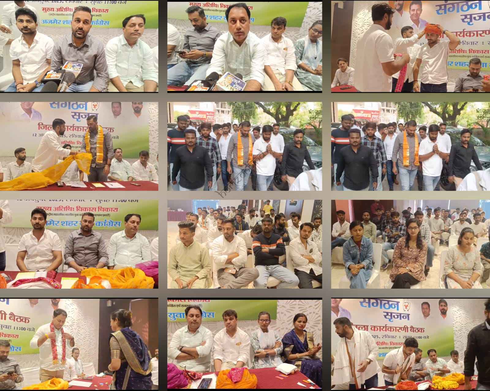 आज 12 अक्टूबर को अजमेर के एक निजी होटल के सभागार में अजमेर युवा कांग्रेस की संगठन सृजन और वोट चोर कार्यक्रम को लेकर जिला कार्यकारणी बैठक रखी गई। जिसमें राष्ट्रीय महासचिव एवं प्रदेश युवा कांग्रेस के प्रभारी विकास चिकारा , प्रदेश सह प्रभारी ज्ञानेश शुक्ला, प्रदेश कार्यकारी अध्यक्ष सुधींद्र मुंड और संभाग सह प्रभारी नरेंद्र प्रताप गुर्जर और जिला प्रभारी तेज करण चौधरी कार्यकारणी बैठक में शामिल हुए।