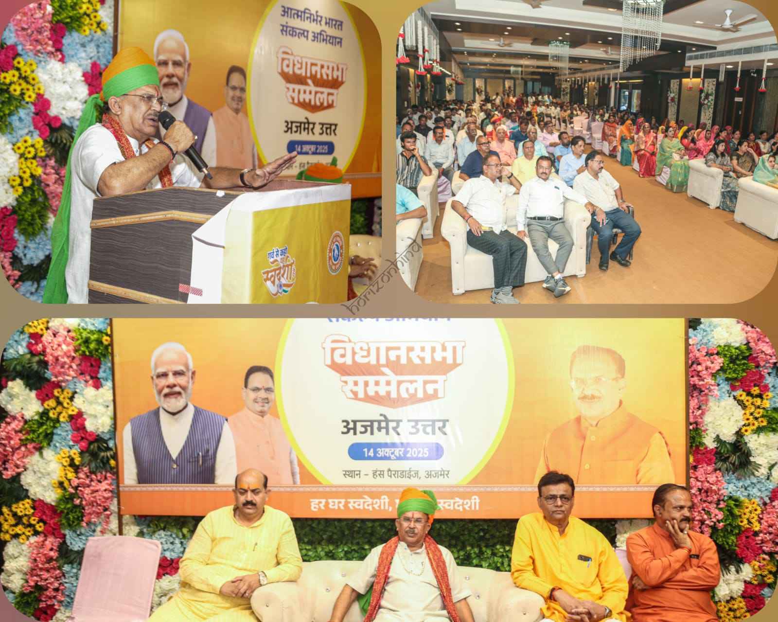 अजमेर, 14 अक्टूबर। विधानसभा अध्यक्ष श्री वासुदेव देवनानी बोले गर्व से कहो स्वदेशी, हर घर स्वदेशी, घर-घर स्वदेशी। आत्मनिर्भर भारत संकल्प अभियान के तहत अजमेर उत्तर विधानसभा क्षेत्र में मंगलवार को विधानसभा सम्मेलन का आयोजन किया गया। इसमें विधानसभा अध्यक्ष श्री वासुदेव देवनानी मुख्य अतिथि के रूप में उपस्थित रहे। इसके तहत देश की आत्मनिर्भरता के संकल्प को सशक्त बनाने और स्वदेशी विचार को समाज के हर वर्ग तक पहुंचाने पर चर्चा की गई ।