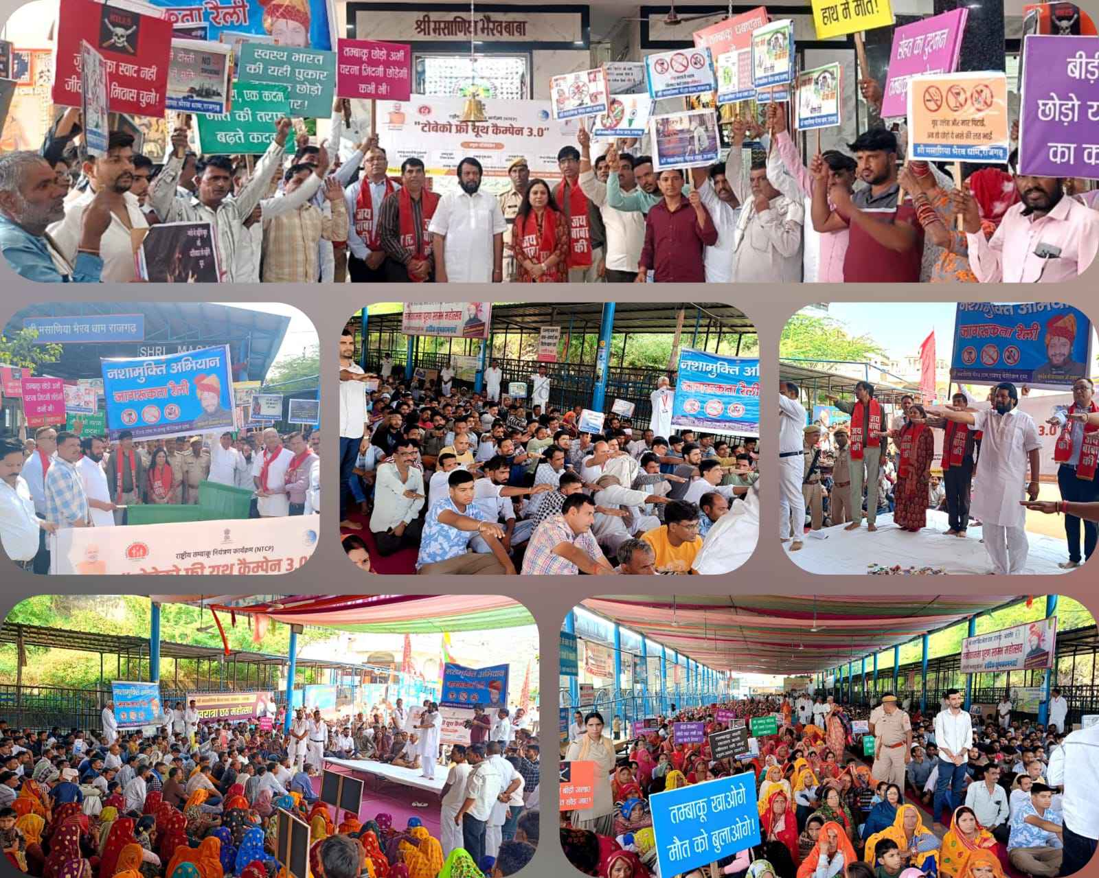 अजमेर जिले के सुप्रसिद्ध सर्वधर्म धार्मिक स्थल श्री मसाणिया भैरव धाम राजगढ़ पर रविवारीय मेले में नशामुक्ति को लेकर राजस्थान सरकार के चिकित्सा एवं स्वास्थ्य विभाग द्वारा संचालित राष्ट्रीय तम्बाकू नियंत्रण कार्यक्रम के अंतर्गत ‘टोबेको फ्री यूथ कैम्पेन 3.0’ व मसाणिया भैरव धाम के संयुक्त तत्वावधान में रविवार को नशामुक्ति हेतु विशेष अभियान चलाया गया। धाम के प्रवक्ता अविनाश सेन ने बताया कि इस अभियान में लगभग पन्द्रह हजार श्रद्धालुओं में से 5100 से अधिक श्रद्धालुओ ने अपने दोनों हाथ उठाकर जीवन में दोबारा नशा नहीं करने का संकल्प लिया जिसमें पुरूषों के साथ महिलाओं की भी भागीदारी रही। नशा त्यागने वाले पुरूषों व महिलाओं ने नशे करने वाली वस्तुओं को बाबा के श्रीचरणो में छोड़ा। आए हुए श्रद्धालुओं ने स्वयं के लिए तथा परिवार को नशे के दुष्प्रभाव से बचाने के लिए स्वेच्छा से नशामुक्ति का संकल्प लिया। इस दौरान शराब, तम्बाकू, गांजा आदि नशा त्यागने का संकल्प लिया गया। श्रद्धालु हाथों मे नशमुक्ति के स्लोगन लिखी तख्यिां व बैनर थामे हुए थे। संकल्प कार्यक्रम में धाम के मुख्य उपासक चम्पालाल महाराज ने श्रद्धालुओं को संबोधित करते हुए कहा कि राजस्थान पत्रिका अपने समाचार पत्र के माध्यम से समाज में सामाजिक चेतना जगाने का कार्य कर रही है। महाराज ने कहा कि राजगढ़ धाम की यही पहचान नशा मुक्त हो कर इन्सान, नशे के ज्यादा सेवन से दुर्घटनाओं व कैंसर जैसी बीमारियों से अधिकतर लोग असमय अकाल मृत्यु को प्राप्त होते हैं। युवा पीढ़ी के कई युवा जिनको नशे की लत लग चुकी है जिससे उनका भविष्य अंधकारमय है। दुर्घटनाओं में अपंगता व मृत्यु, समाज में गरीबी व भयंकर बीमारियों से अकाल मृत्यु का मूल कारण नशा ही होता है इसलिये नशे का त्याग अवश्य ही करना चाहिये। युवा, महिलाओं व लोगों को नशामुक्त करने के लिए राजस्थान सरकार चिकित्सा विभाग सामाजिक सरोकार में श्री मसाणिया भैरव धाम राजगढ़ के साथ अपनी भागीदारी निभाते रहेंगे। नशामुक्ति महाअभियान को रैली को पूर्व आईपीएस महेन्द्र सिंह चौधरी, हरीश कुमार नयायाधीश चुरू ने चम्पालाल महाराज के सानिध्य में रैली को हरी झंडी दिखाकर रवाना किया। वही राजस्थान पत्रिका के सम्पादकीय प्रभारी चन्द्रप्रकाश जोशी व चिकित्सा एवं स्वास्थ्य विभाग अजमेर की जिला सलाहकार डॉ. पूनिता जैफ ने सम्बाधित किया। धाम में अब तक नशामुक्ति महाअभियान के अंतर्गत पिछले कई वर्षों में लाखों लोगों का नशा छुड़ाया गया है। धाम के प्रवक्ता सेन ने बताया कि नशामुक्ति अभियान को सफल बनाने में चन्द्रप्रकाश जोशी, रक्तिम तिवाडी, जय मखीजा, चिकित्सा एवं स्वास्थ्य विभाग अजमेर की जिला सलाहकार डॉ. पूनिता जैफ व जितेन्द्र हरच