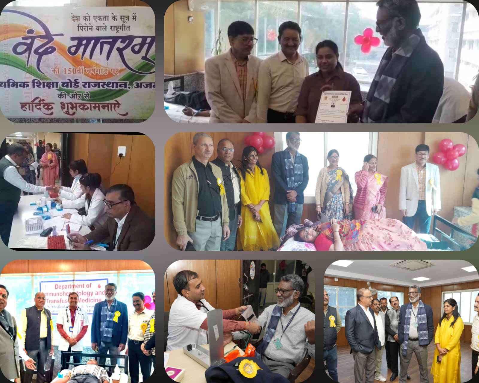 अजमेर,वन्देमातरम्@150 कार्यक्रमों की श्रृंखला के अन्तर्गत राजस्थान माध्यमिक शिक्षा बोर्ड प्रांगण में शुक्रवार, 21 नवम्बर को प्रातः 10 बजे से रक्तदान शिविर का आयोजन किया गया। माध्यमिक शिक्षा बोर्ड सचिव गजेन्द्र सिंह राठौड़ ने बताया कि इस रक्तदान शिविर में समस्त सामाजिक संगठन, स्वयं सेवी संस्थाएं, शिक्षक वर्ग, कर्मचारी एवं आमजन ने स्वैच्छिक रक्तदान किया है।जेएलएन अस्पताल की मेडिकल टीम यहां रक्त एकत्रित करने का काम कर रही है। सभी में रक्तदान करने को लेकर काफ़ी उत्साह है। इस मौके पर बोर्ड प्रशासक शक्ति सिंह राठौड़,सचिव गजेंद्र सिंह राठौड़ सहित कर्मचारी संगठनों के प्रतिनिधि, अधिकारी और कर्मचारी मौजूद रहे।