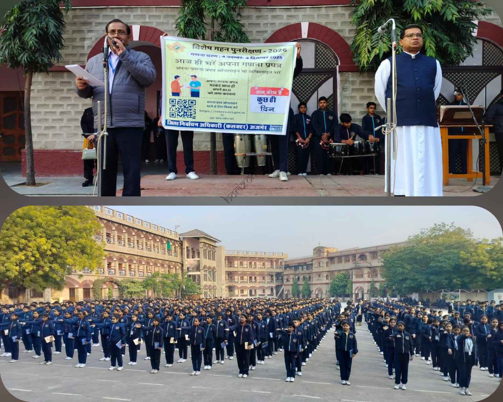 अजमेर, 26 नवम्बर। जिला निर्वाचन अधिकारी श्री लोक बन्धु के निर्देशानुसार बुधवार को सेंट एस्लम स्कूल के स्कूल स्टाफ एवं विद्यार्थियों को एसआईआर के अन्तर्गत अपना और अपने परिवार के मतदाताओं का परिगणना प्रपत्र आज ही ऑनलाईन करने के लिए कहा गया। इससे ज्यादा से ज्यादा मतदाताओं की मैपिंग होने के साथ उनका मतदाता सूची में नाम सत्यापित होकर जुड़ जाना सुनिश्चित हो सके। इस कार्यक्रम में 2650 स्टाफ एवं विद्यार्थियों ने अपनी उपस्थिति के साथ आज ही परिगणना प्रपत्र भरने का वादा किया। इसके साथ ही दिव्यांग मतदाता श्री अर्पण कुमार चौधरी, किन्नर गद्दीपति सलोनी बाई एवं वरिष्ठ नागरिक श्री ओमप्रकाश अग्रवाल ने सुपरवाइजर श्री नरेंद्र कुमार माहेश्वरी के नेतृत्व में मतदाताओं को अपना परिगणना प्रपत्र ऑनलाइन करने और ई-मित्र के माध्यम से 4 दिसम्बर से पहले भर कर ऑनलाइन करवाने की अपील की है।