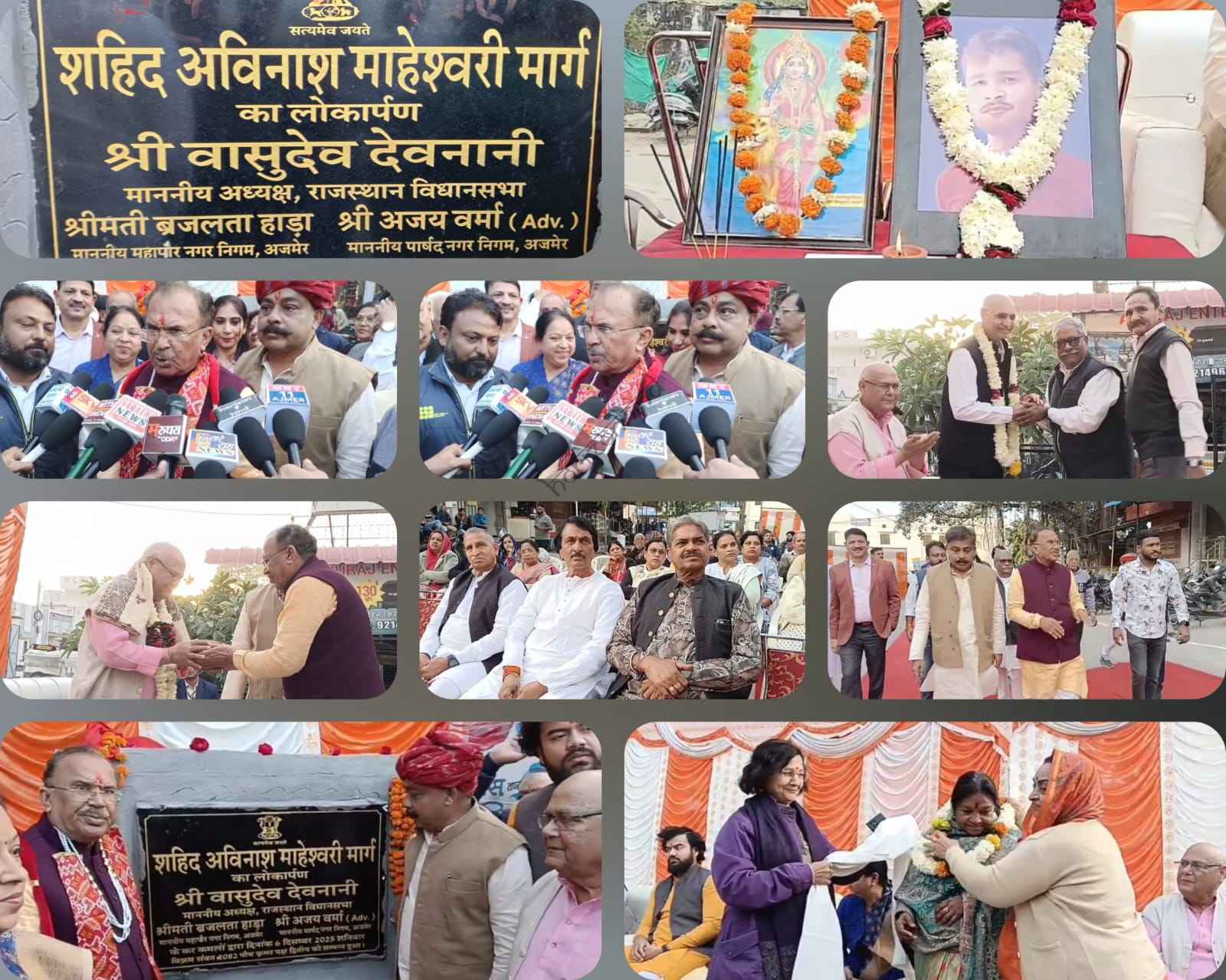शनिवार को उत्तर विधानसभा विधायक और विधानसभा अध्यक्ष वासुदेव देवनानी व स्थानीय पार्षद अजय वर्मा किसानिद में आनासागर पुलिस चौकी से लेकर प्रेम नगर तक के सड़क मार्ग का नामकरण शहीद अविनाश महेश्वरी मार्ग किया गया इस अवसर पर स्थानीय लोगों के साथ शहीद अविनाश महेश्वरी के परिवारजन भी मौजूद रहे विधानसभा अध्यक्ष वासुदेव देवनानी और अजय वर्मा ने बताया कि आज से 32 साल पहले राम मंदिर आंदोलन में बाबरी मस्जिद को दहाने में अपनी जान की बाजी लगाकर बलिदान देने वाले अजमेर के लाडले शौर्य वीर शहीद अविनाश महेश्वरी को सच्ची श्रद्धांजलि अर्पित करने के लिए उन्होंने नगर निगम में इस मार्ग का नामकरण शहीद अविनाश के नाम पर करने की एक अर्जी लगाई थी जिस पर हरी झंडी मिलते ही आज इस मार्ग का नाम शहीद अविनाश महेश्वरी मार्ग कर दिया गया है आज ही 6 दिसंबर है और आज के दिन ही बाबरी मस्जिद नहाने के दौरान अजमेर के अविनाश महेश्वरी शहीद हुए थे ऐसे में यह उन्हें सच्ची श्रद्धांजलि है।