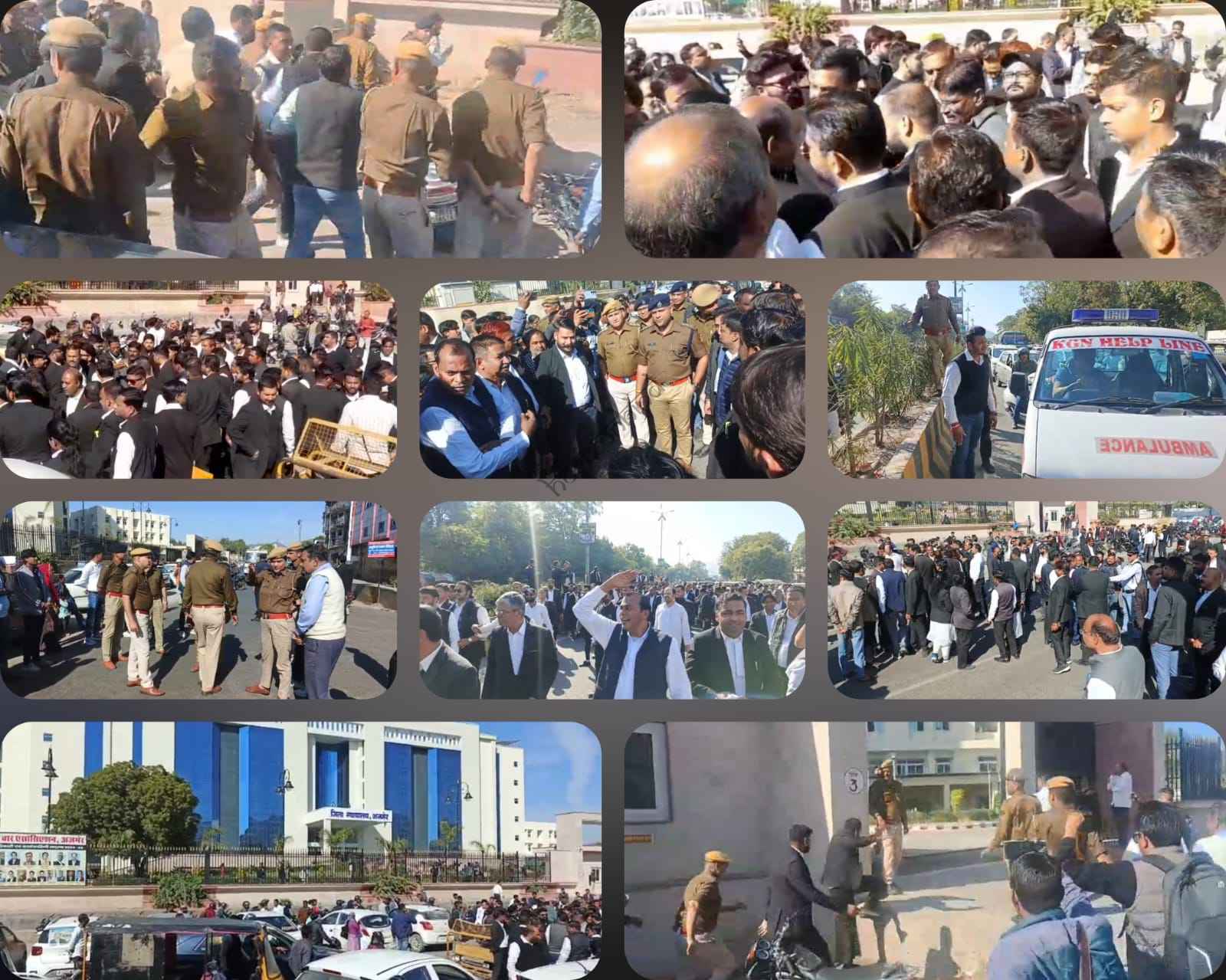 अजमेर जिला न्यायालय के बाहर स्पीड ब्रेकर की मांग को लेकर वकीलों का उग्र प्रदर्शन, अजमेर–जयपुर रोड 2 घंटे जाम,