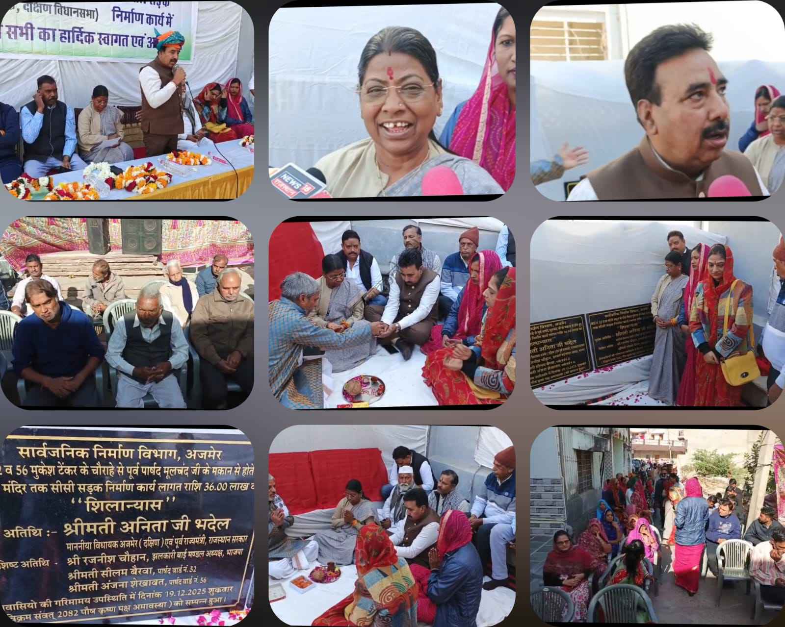 19 दिसम्बर 2025 शुक्रवार को सुबह 9:30 बजे अजमेर दक्षिण विधायक श्रीमती अनिता भदेल द्वारा 69 लाख रुपये की लागत से वार्ड 52 ओर वार्ड 56 में राजा कोठी स्कूल के पीछे स्थित पुलिया से कल्याणीपुरा रोड़ तक सीसी सड़क एवं मुकेश टेंकर के चौराहे से पूर्व पार्षद मूलचंद जी के मकान होते हुए बालाजी मंदिर तक सीसी सड़क निर्माण कार्य का विधिवत पूजा अर्चना कर शिलान्यास किया गया।