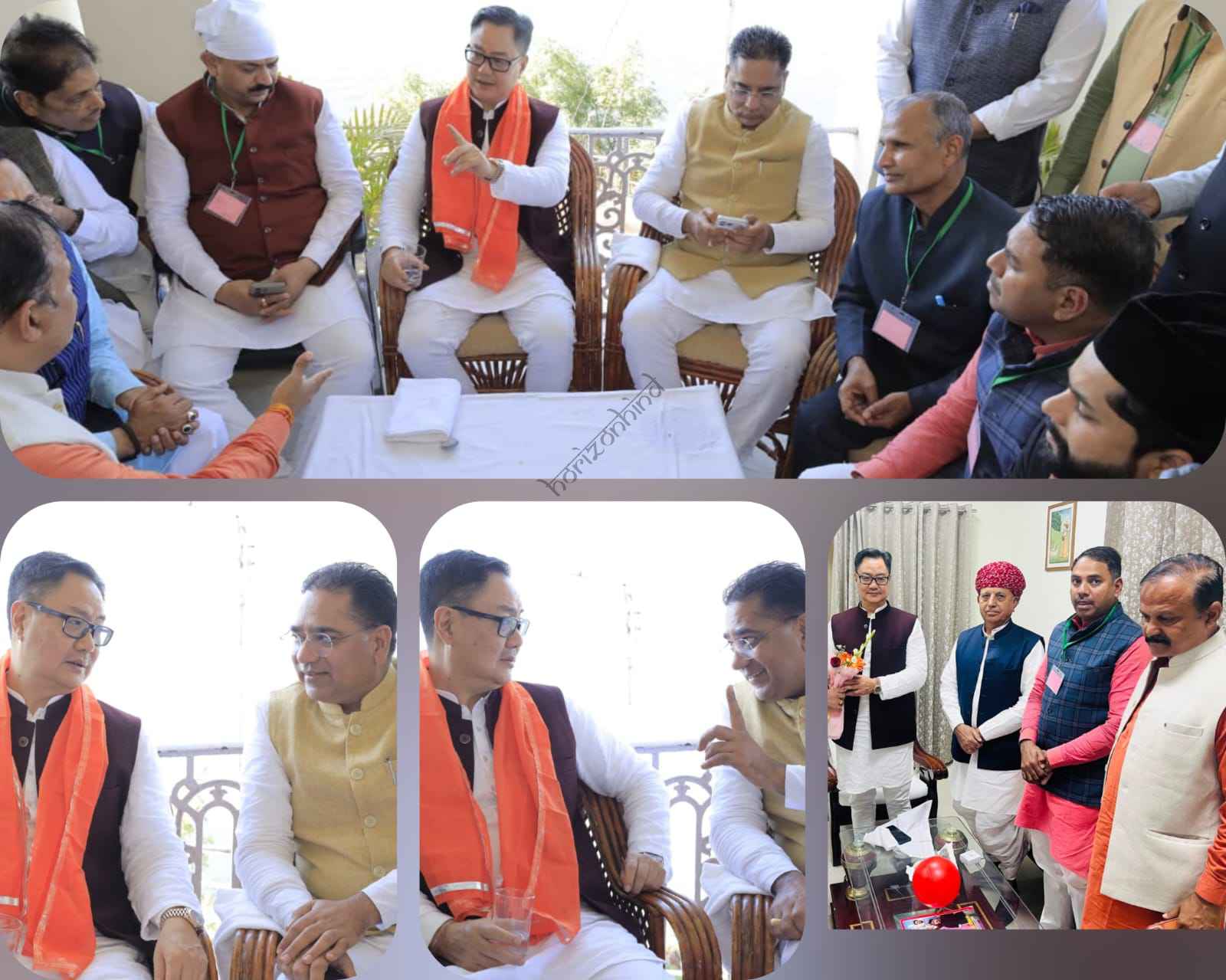 केंद्रीय मंत्री श्री किरेन रिजिजू के अजमेर आगमन पर सर्किट हाउस में जल संसाधन मंत्री श्री सुरेश सिंह रावत ने शिष्टाचार मुलाकात की, जिसमें क्षेत्र के विकास और सांप्रदायिक सौहार्द को लेकर चर्चा की गई। मंत्री रावत ने राजस्थानी परंपरा के अनुसार केंद्रीय मंत्री का अभिनंदन किया।