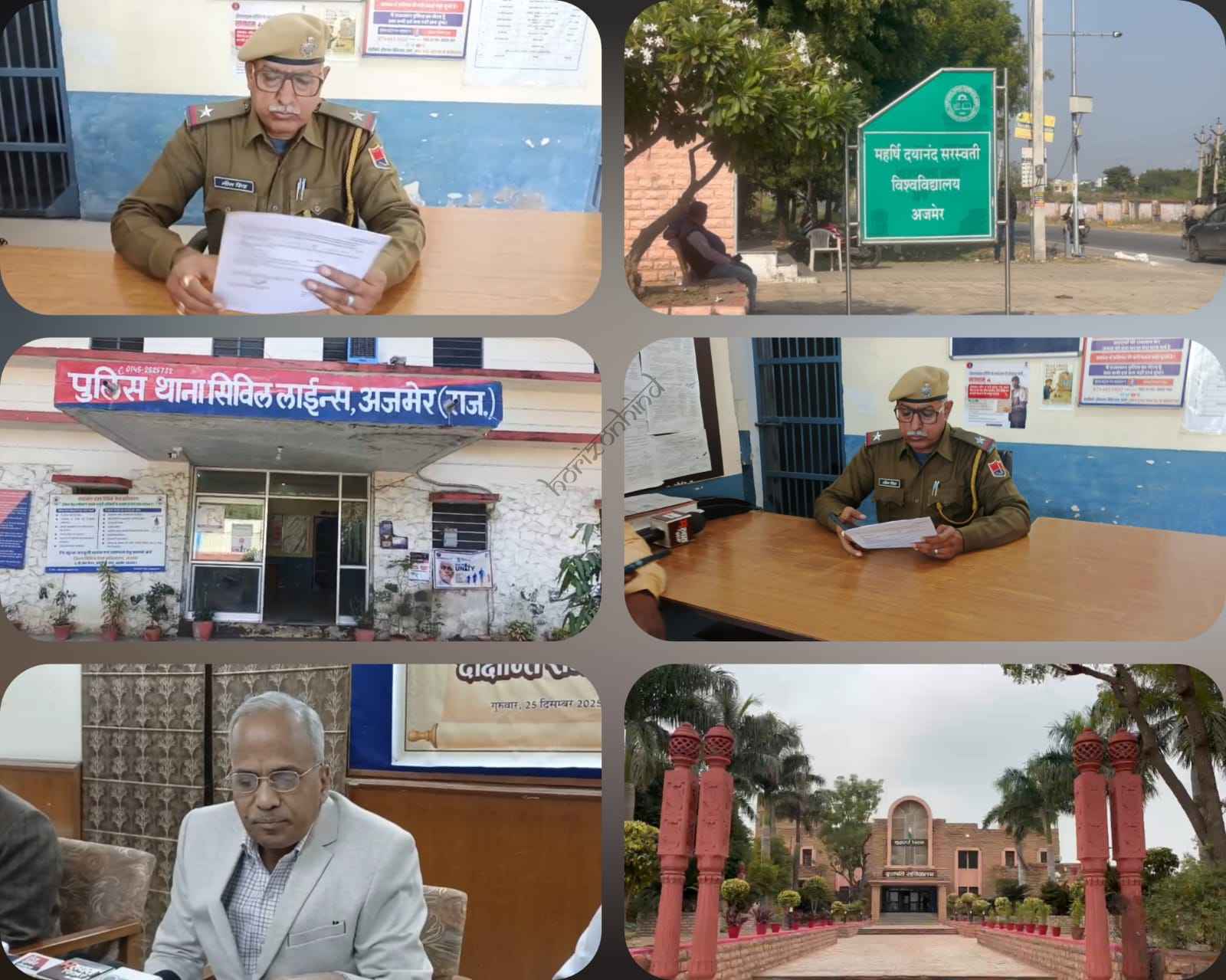 महर्षि दयानंद सरस्वती विश्वविद्यालय अजमेर के कुलगुरु प्रोफेसर सुरेश कुमार अग्रवाल को प्राइवेट कॉलेज संचालक के नाम से धमकाने का मामला सामने आया है। आरोप है कि कुलगुरु पर नियम विरूद्ध एडमिशन करने का दबाव बनाया और अभद्र व अपमानजनक भाषा का प्रयोग किया। यूनिवर्सिटी प्रशासन की रिपोर्ट सिविल लाइन थाना पुलिस ने मामला दर्ज किया। पुलिस मामले की जांच में जुटी है।