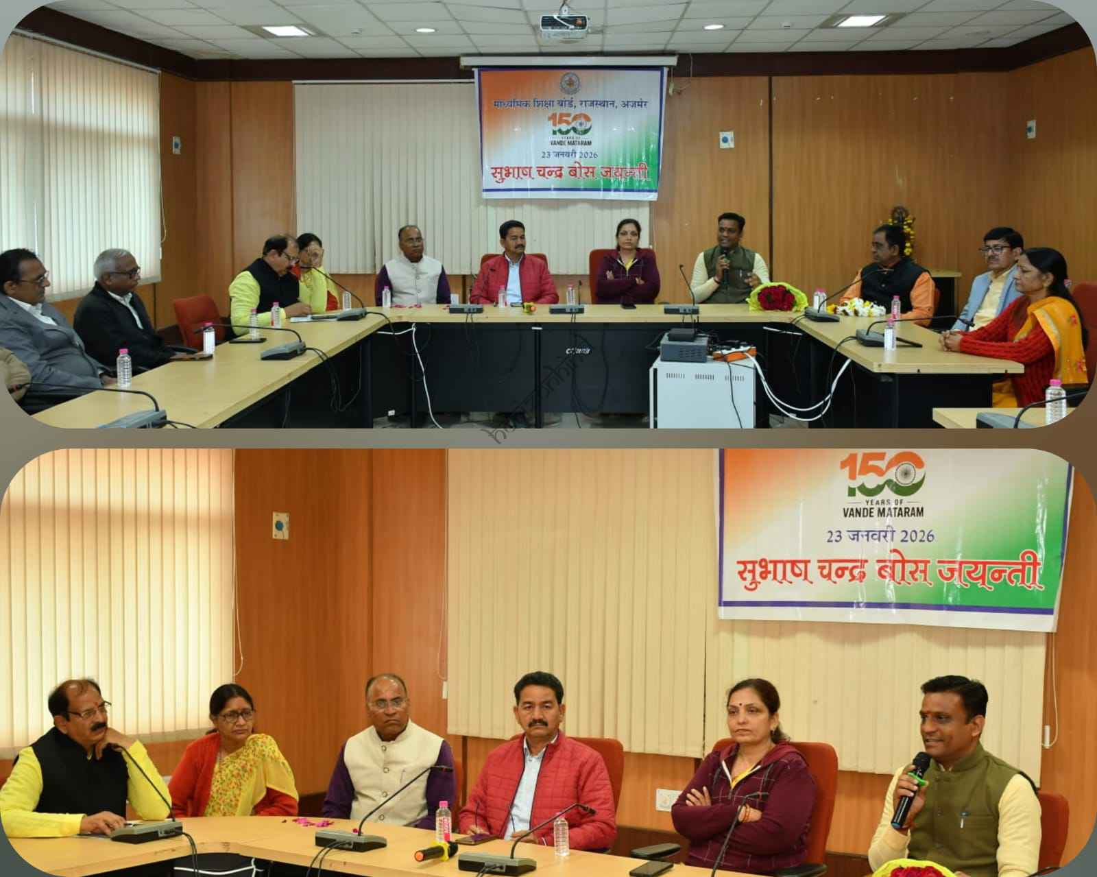 अजमेर, 23 जनवरी। राष्ट्रगीत वंदे मातरम् के रचनाकाल के 150 वर्ष पूर्ण होने उपलक्ष्य में आयोजित कार्यक्रमों के द्वितीय चरण के अंतर्गत शुक्रवार को राजस्थान माध्यमिक शिक्षा बोर्ड कार्यालय में वन्दे मातरम् के वाचन के साथ नेताजी सुभाष चन्द्र बोस की जयंती मनाई गई। उनकी जयन्ती के अवसर पर संगोष्ठी का भी आयोजन किया गया। इस संगोष्ठी में बोर्ड के अधिकारी तथा कर्मचारियों के साथ विद्या भारती संस्थान के शिक्षाविद् श्री भूपेन्द्र उबाना ने अपना व्याख्यान प्रस्तुत किया।
