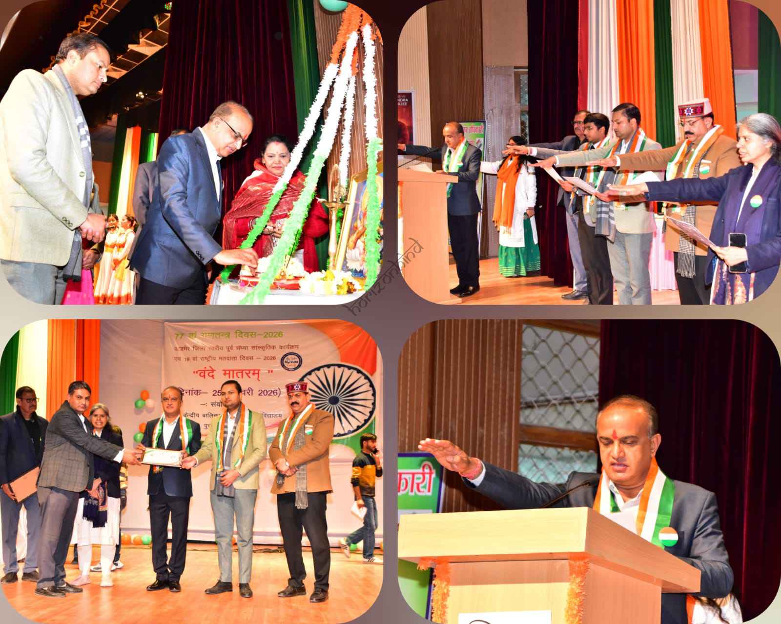 अजमेर, 25 जनवरी। गणतंत्र दिवस की पूर्व संध्या पर रविवार को जिले में 16वें राष्ट्रीय मतदाता दिवस का आयोजन मेरा भारत, मेरा वोट थीम के अंतर्गत गरिमामय रूप से किया गया। जिला स्तरीय सांस्कृतिक संध्या कार्यक्रम में मतदाता शपथ दिलाई गई तथा बच्चों के लिए मतदाता जागरूकता प्रदर्शनी का आयोजन किया गया। इसके साथ ही विशेष गहन पुनरीक्षण कार्यक्रम के अंतर्गत उत्कृष्ट कार्य करने वाले अधिकारियों एवं कर्मचारियों को सम्मानित किया गया।