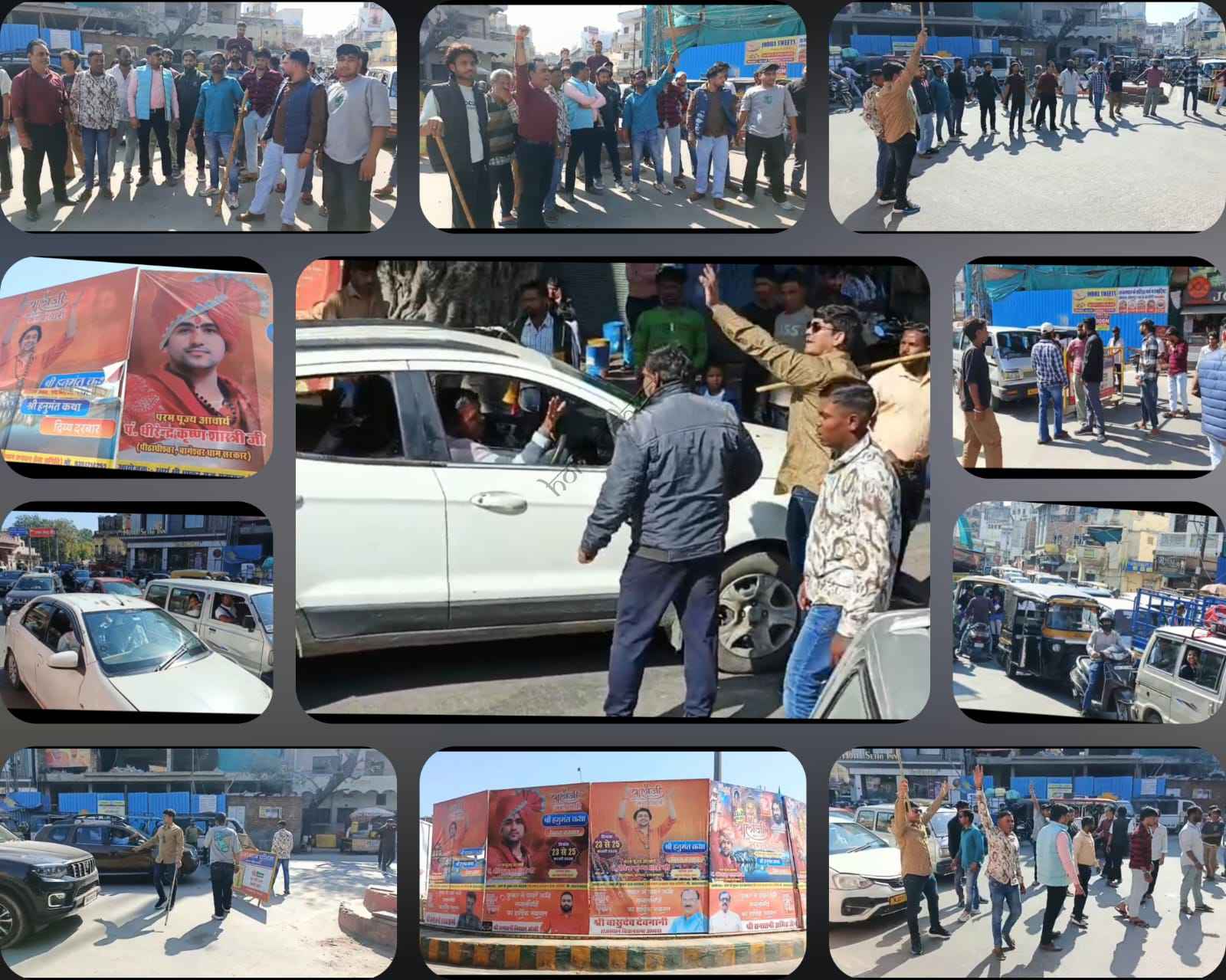 फव्वारा चौराहे पर बागेश्वर धाम के कथा वाचक पंडित धीरेंद्र कृष्ण शास्त्री की हनुमंत कथा आयोजन के पोस्टर फाड़े जाने के विरोध में बजरंग दल का प्रदर्शन,