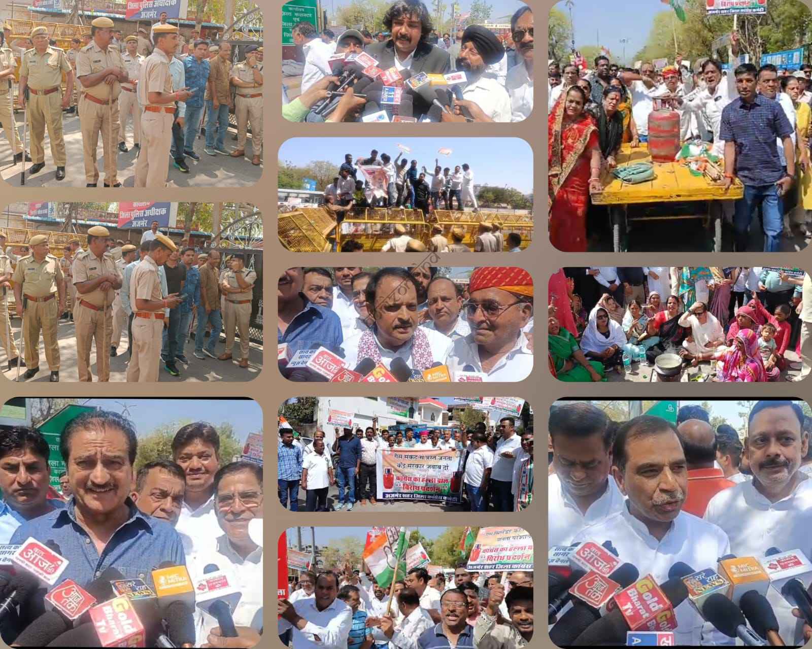 डेयरी अध्यक्ष रामचंद्र चौधरी, पूर्व चिकित्सा मंत्री रघु शर्मा, कांग्रेस शहर जिला अध्यक्ष डॉ राजकुमार जयपाल आदि नेताओं ने बताया कि मोदी सरकार की विदेश नीति पूरी तरह से फेल साबित हो रही है ना वह किसी को खुश रख पा रहे हैं ना किसी को नाराज कर पा रहे हैं। ऐसे में असमंजस की स्थिति के बीच विदेशों से आयात होने वाला कच्चा माल देश में नहीं पहुंच पा रहा। मोदी अमेरिका की गुलामी करने में लगे हैं ऐसे देश चलने वाला नहीं है यह सरकार जाने वाली है। जनता को कोई राहत नहीं मिल रही महंगाई दिन पर दिन बढ़ रही है। गैस के दाम अचानक ₹60 प्रति सिलेंडर बढ़ा दिए गए जिससे उपभोक्ता की कमर टूट रही है। वहीं होटल व्यवसाईयों को व्यावसायिक सिलेंडर भी नहीं मिल पा रहे जिससे कारोबार बंद होने की कगार पर आ गया है। इस सरकार से हर खासो आम परेशान है। सरकार को इसका जवाब देना होगा। यदि जल्दी सिलेंडर की उपलब्धता सुनिश्चित नहीं की गई और दाम नहीं घटाए गए तो कांग्रेस का आंदोलन और उग्र होता जाएगा।