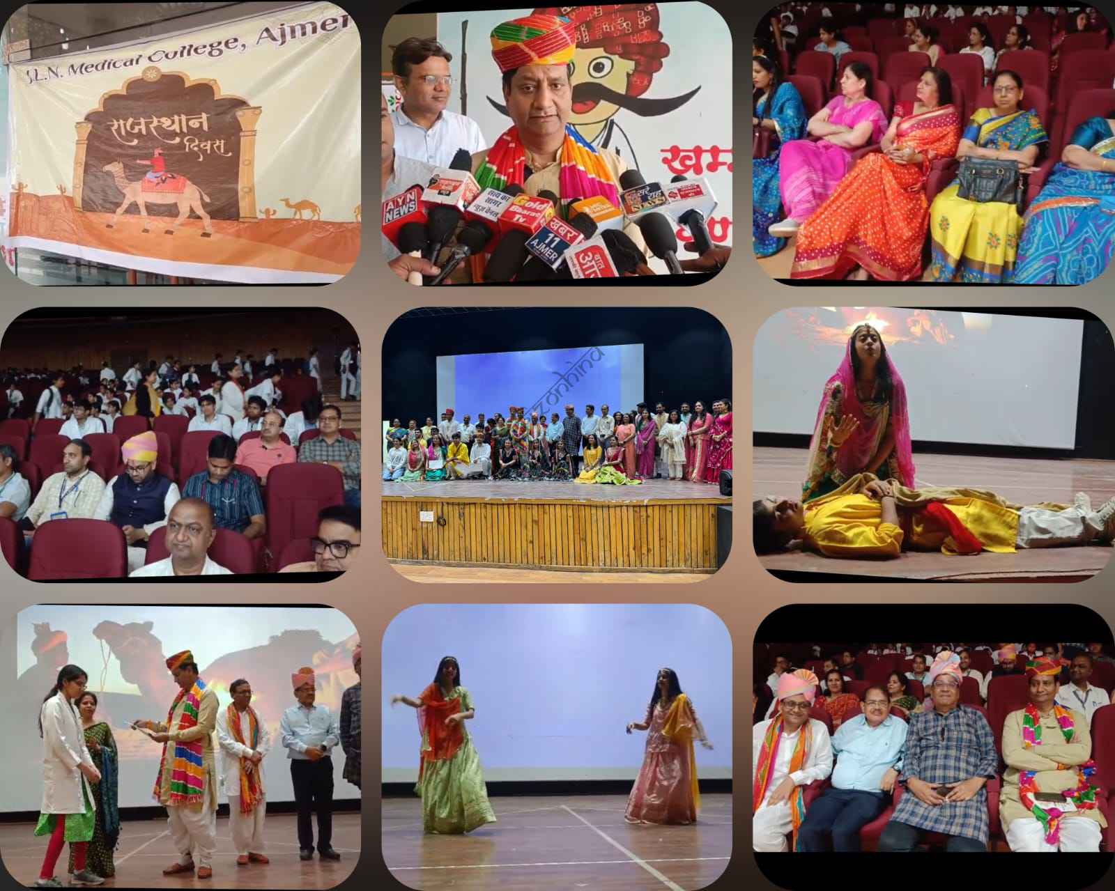 राजस्थान दिवस पखवाड़े के अंतर्गत आज जवाहरलाल नेहरू मेडिकल कॉलेज के अम्बेडकर सभागार में राजस्थान दिवस के अवसर पर सांस्कृतिक कार्यक्रम का आयोजन किया गया। इसमें संकाय सदस्यों एवं विद्यार्थियों ने बढ़-चढ़कर भाग लेकर राजस्थानी संस्कृति को लेकर कई शानदार प्रस्तुति दी।कार्यक्रम में राजस्थान की धरोहर एवं संस्कृति को दर्शाते हुए गीत, संगीत, कालबेलिया नृत्य, कविता पाठ आदि की मनमोहक प्रस्तुतियाँ दी गईं, जिन्होंने सभी को राजस्थान की रंगीली संस्कृति से सराबोर कर दिया तथा वीर भूमि राजस्थान के वीर सपूतों को स्मरण किया गया।कार्यक्रम का संचालन डॉ. महेंद्र खन्ना, विभागाध्यक्ष (पीएसएम) द्वारा किया गया। कार्यक्रम के मुख्य अतिथि प्राधानाचार्य डॉ. अनिल सामरिया रहे। जबकि विशिष्ट अतिथियों में अतिरिक्त प्राचार्य डॉ. सुनील माथुर , डॉ. हेमेशवर हर्षवर्धन, डॉक्टर मनीराम कुमहार , डॉ. दीपा , डॉ. गरिमा तथा वरिष्ठ प्रोफेसर डॉ. रंजना , डॉ. आभा भारद्वाज , डॉ. एम.पी. शर्मा , डॉ. श्याम भूतडा , डॉ. पूनम , डॉ. दीप्ति, डॉ मीना शर्मा , डॉ. लोकेश अग्रवाल, डॉक्टर लोकेश ,डॉक्टर भैरव लाल जाट आदि उपस्थित रहे।इस अवसर पर सभी संकाय सदस्य, स्वास्थ्यकर्मी एवं छात्र-छात्राओं ने सक्रिय भागीदारी निभाई।अंत में धन्यवाद ज्ञापन डॉ. महेश मेहता द्वारा प्रस्तुत किया गया।