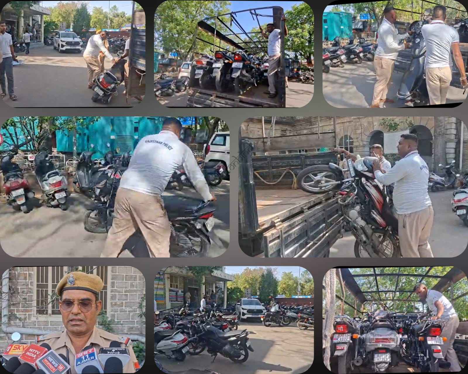 अजमेर ट्रैफिक पुलिस ने जिला कलेक्ट्रेट परिसर में नो पार्किंग में खड़े दोपहिया वाहन किए जप्त, ट्रक में भर कर पहुंचाया ट्रैफिक कार्यालय एमवी एक्ट में की कार्रवाई,