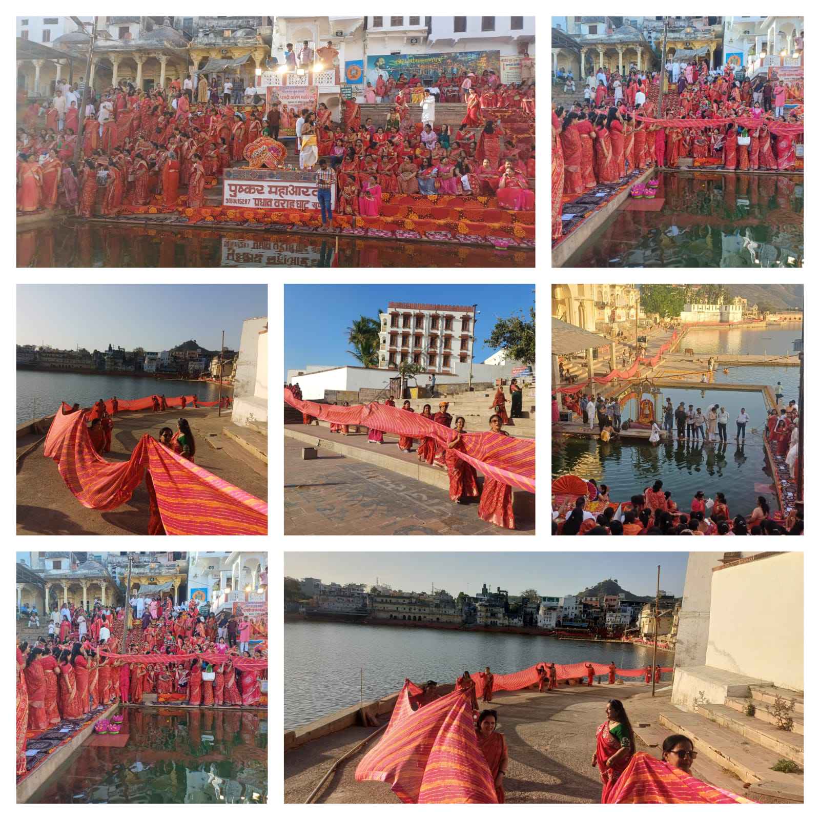 करीब 1800 मीटर लंबी पगड़ी को पूरे पुष्कर सरोवर के 52 घाटों के चारों ओर अर्पित किया गया। यह दृश्य न केवल अद्भुत था, बल्कि श्रद्धा और सांस्कृतिक विरासत का जीवंत प्रतीक भी बन गया। घाटों पर लाल साड़ियों में सजी महिलाएं, हाथों में पूजा की थाल और वातावरण में गूंजते भजन—हर क्षण भक्ति में डूबा नजर आया।अंतरराष्ट्रीय वैश्य महासम्मेलन के जिला महामंत्री उमेश गर्ग ने बताया कि यह आयोजन वर्षों की परिकल्पना का परिणाम है। महिला इकाई द्वारा भगवान ब्रह्मा को पगड़ी अर्पित करने की परंपरा को इस बार भव्य स्वरूप दिया गया। अजमेर, जयपुर, मकराना और किशनगढ़ से आई 350 से अधिक महिलाओं ने इस आयोजन में भाग लेकर इसे ऐतिहासिक बना दिया। कार्यक्रम के आचार्य पंडित रविकांत शर्मा ने बताया कि श्रीमती वर्षा फतेहपुरिया के नेतृत्व में आयोजित इस महोत्सव में पगड़ी अर्पण केवल एक परंपरा नहीं, बल्कि श्रद्धा और सम्मान का प्रतीक है। उन्होंने कहा कि तीन वर्षों से संजोया गया यह सपना आज साकार हुआ। आयोजन के दौरान विशेष पूजन, अभिषेक, आरती, महाआरती और भगवान का विशेष श्रृंगार किया गया, वहीं पहली बार लाइव संकीर्तन ने श्रद्धालुओं को मंत्रमुग्ध कर दिया। इस भव्य आयोजन की खास बात यह रही कि सात समंदर पार से आई रूसी पर्यटक वोल्गा भी भारतीय संस्कृति से अभिभूत नजर आईं। उन्होंने कहा, “आज का दिन बेहद खास है। पुष्कर सरोवर भगवान ब्रह्मा का प्रतीक है और महिलाएं उनके सम्मान में पगड़ी अर्पित कर रही हैं। यहां की परंपरा और आस्था ने मुझे बहुत प्रभावित किया है। लाल रंग शक्ति और सच्ची भक्ति का प्रतीक है, इसलिए मैंने भी इसे धारण किया।” महोत्सव में मेहंदी उत्सव, दीपदान और रंगोली जैसे रंगारंग कार्यक्रमों ने माहौल को और अधिक जीवंत बना दिया। भजन संध्या और महाआरती के दौरान घाटों पर उमड़ी श्रद्धालुओं की भीड़ ने इस आयोजन को अविस्मरणीय बना दिया।