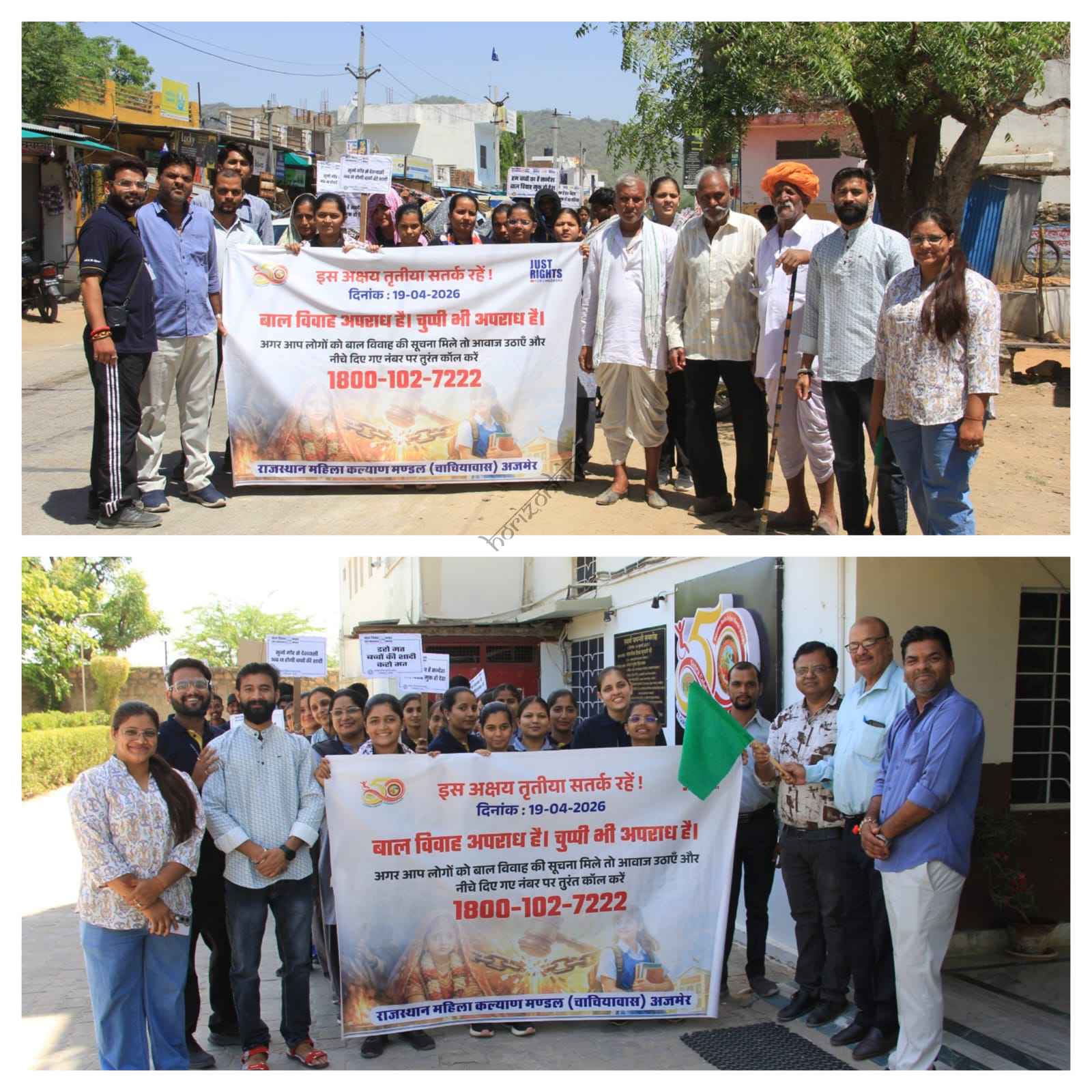 अजमेर, 18 अप्रैल 2026 अजमेर जिले में बाल अधिकारों की सुरक्षा व बाल विवाहों की रोकथाम के लिए काम कर रहे संगठन राजस्थान महिला कल्याण मंडल ने अक्षय तृतीया के अवसर पर बाल विवाहों की रोकथाम के लिए सतर्कता दिवस मनाते हुए जागरूकता रैली का आयोजन किया गया राजस्थान महिला कल्याण मंडल जिला प्रशासन, पंचायतों, स्कूलों और धर्मगुरुओं के साथ मिलकर जिले को बाल विवाह मुक्त बनाने के लिए स्कूलों, पंचायतों और गांवों में बाल विवाह के खिलाफ जागरूकता अभियान चला रहा है और अजमेर जिले में लोगों को बाल विवाह के खिलाफ शपथ दिलाई है। संगठन खास तौर से बाल विवाह के लिहाज से संवेदनशील अक्षय तृतीया जैसे मौकों पर प्रशासन व सरकार के सहयोग से इसकी रोकथाम के लिए विशेष अभियान चलाता रहा है। राजस्थान महिला कल्याण मंडल देश में बाल अधिकारों की सुरक्षा व संरक्षण के लिए 250 से भी अधिक नागरिक समाज संगठनों के देश के सबसे बड़े नेटवर्क जस्ट राइट्स फॉर चिल्ड्रेन का सहयोगी संगठन है।