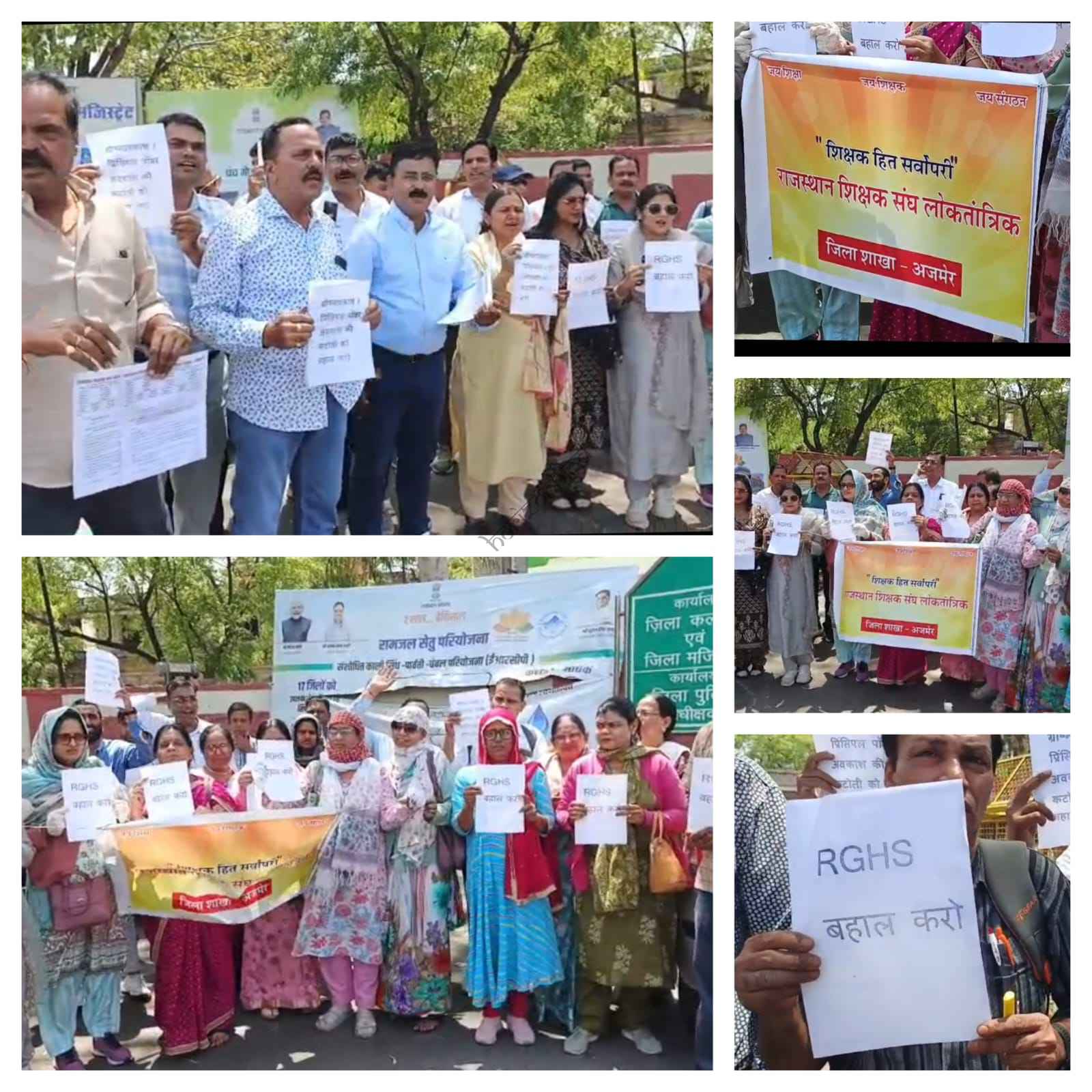 इसको लेकर शिक्षकों ने हाथों में आरजीएचएस बहाल करो, अवकाश कटौती बहाल करो जैसे नारे लिखी तख्तिया लेकर नारेबाजी करते हुए प्रदर्शन किया और शिक्षकों के एक प्रतिनिधिमंडल ने जिला कलेक्टर को ज्ञापन सोपा। बृजेंद्र शर्मा ने बताया कि राजस्थान सरकार के कर्मचारी और पेंशनर्स आरजीएचएस योजना के अंतर्गत निरंतर गंभीर समस्याओं का सामना कर रहे हैं।
