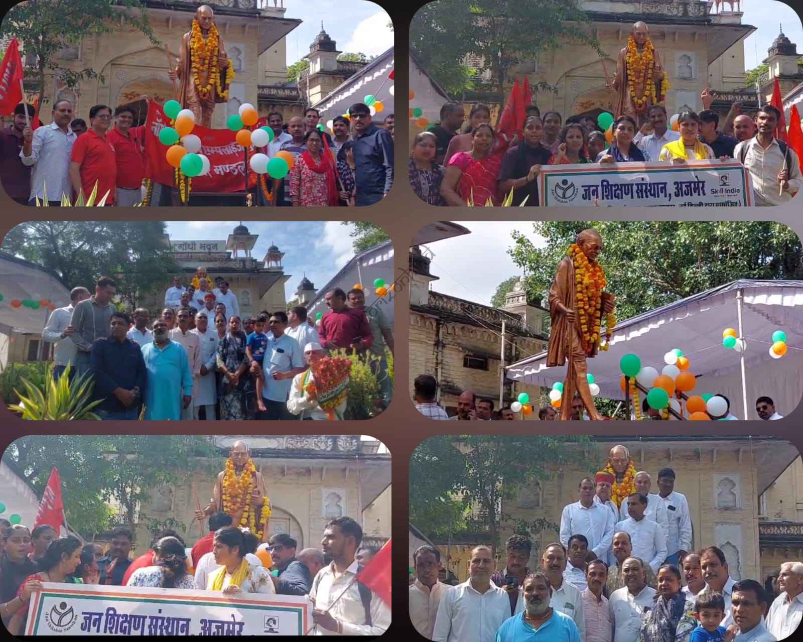 अजमेर न्यूज़: 2 अक्टूबर गुरुवार गांधी जयंती के अवसर पर गांधी भवन स्थित महात्मा गांधी की प्रतिमा पर विभिन्न राजनीतिक सामाजिक और कर्मचारी संगठनों के द्वारा बापू की प्रतिमा पर माल्यार्पण और पुष्पांजलि अर्पीटकर उन्हें नमन किया गया और त्याग तपस्या और बलिदान के पुजारी को याद करते हुए उनके बताए मार्ग पर चलने का संकल्प दोहराया गया शहर जिला कांग्रेस कमेटी के लिए वर्तमान जिला अध्यक्ष विजय जैन के नेतृत्व में कांग्रेस के वरिष्ठ नेताओं और कार्यकर्ताओं ने बापू की प्रतिमा पर माल्यार्पण किया और महात्मा गांधी अमर रहे के नारों से गांधी भवन को गुंजा बंद कर दिया इस मौके पर लोकसभा प्रत्याशी अजमेर डेयरी अध्यक्ष रामचंद्र चौधरी विधानसभा प्रत्याशी महेंद्र सिंह रलावता सहित कांग्रेस के पदाधिकारी और कार्यकर्ता मौजूद रहे और सभी ने बापू के दिखाएं मार्ग पर चलने का संकल्प दोहराया। वही नॉर्थ वेस्टर्न रेलवे एम्पलाइज यूनियन और जन शिक्षण संस्थान के तत्वाधान में रेलवे कॉलोनी फ्रेजर रोड से एक रैली निकली गई जो विभिन्न रास्तों से होते हुए गांधी भवन पहुंची। जहां पर सभी ने गांधी जी की प्रतिमा पर पुष्पांजलि अर्पित की और स्वच्छ भारत स्वस्थ भारत बनाने की शपथ ली। कर्मचारी नेता मोहन चेलानी ने बताया कि आज फ्रेजर रोड रेलवे कॉलोनी की गार्डन में साफ सफाई की गई और पूर्व में लगाए गए पौधों की कर रखरखाव करते हुए कार्य बनाई गई कुछ पौधे मृत हुए थे उनकी जगह नए पौधे लगाए गए वहां से जन शिक्षण संस्थान के साथ एक रैली निकाली गई जिसमें सभी ने बापू को याद करते हुए स्मारक पहुंचकर पुष्पांजलि अर्पित की है।
